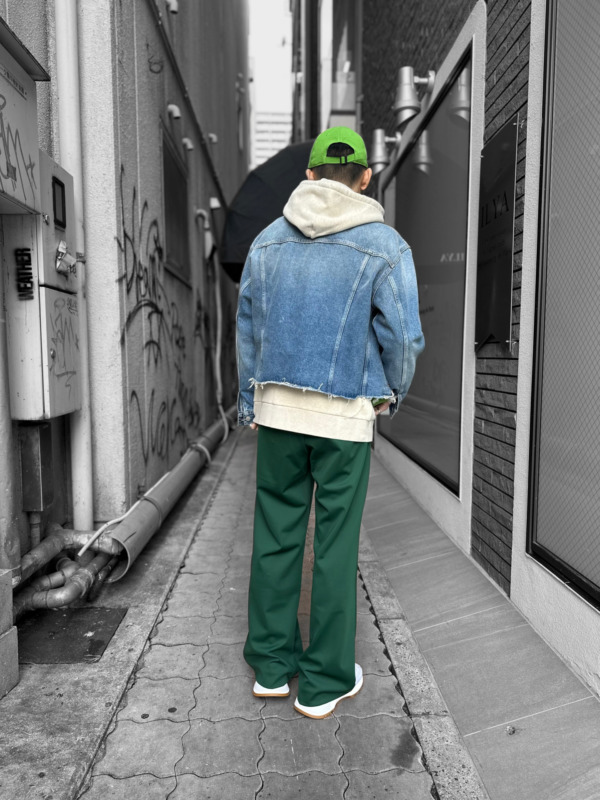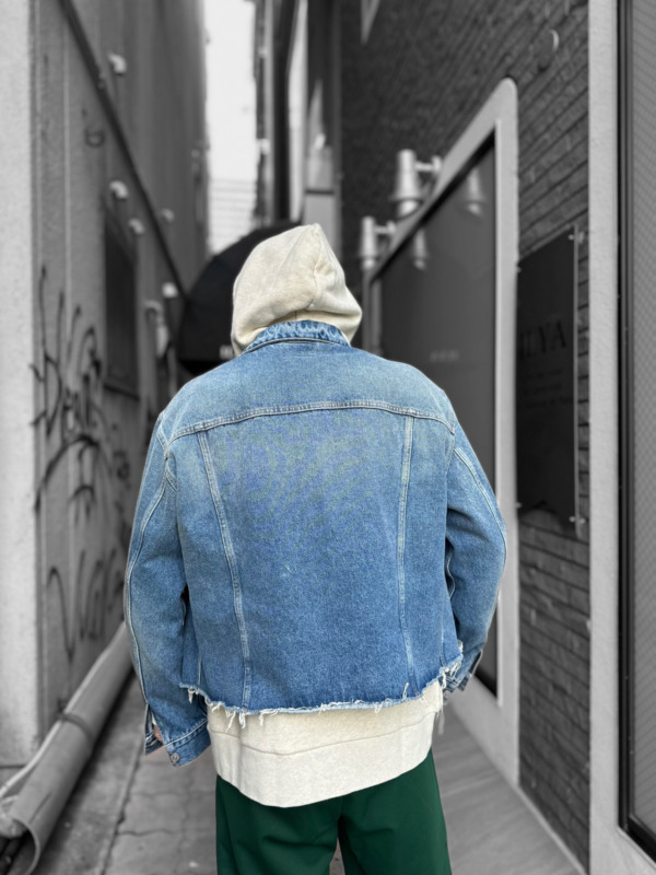 デニムジャケットは、MM6。トレンド感のある短丈で仕上げ、インナーとのレイヤードな着こなしを楽しませてくれます。裾はカットオフのデザインで、オシャレ感もあり、どんなスタイリングにも決まります。また、春の季節だけではなく、オールシーズン対応の着やすさのある素材感になっています。