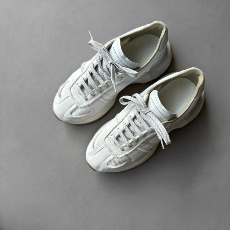 ジャーマントレーナー、Newエボリューションに続く、マルジェラが誇るスニーカーの50/50。マルジェラらしく大胆でキャッチあるデザインが特徴。ソールも含めてボリューム感もあり、トレンドを抑えつつ、質感の良いレザーとナイロンのコンビネーションで高級感を演出します。また、インソールにレザーを使用し、抜群の履き心地が相まって、やみつきになる一足です。