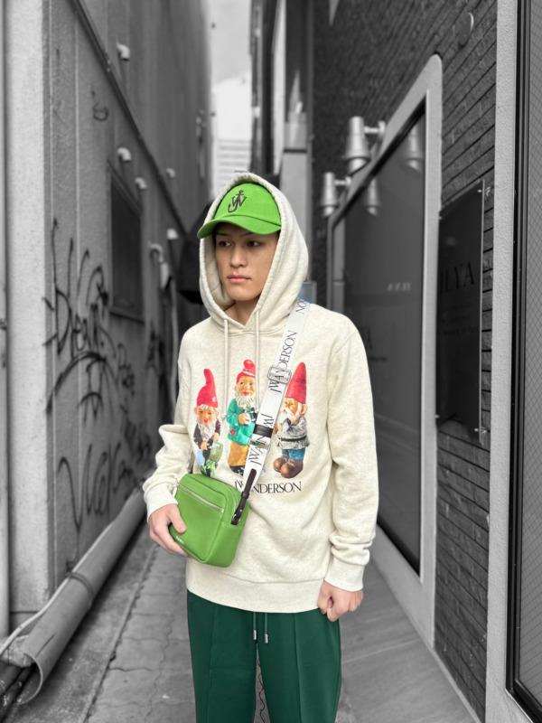 インナーのフーディーもJWアンダーソン。ミラコレにおいてもデザイン力が高く評価されるJWの今季のデザインに施されたユニークなブリキの妖精。可愛らしさがあるも、見事なバランスが取れたプリントが大人な印象を与えてくれます。メランジ素材でとても柔らかく、抜群の着心地の良さも魅力の一つです。