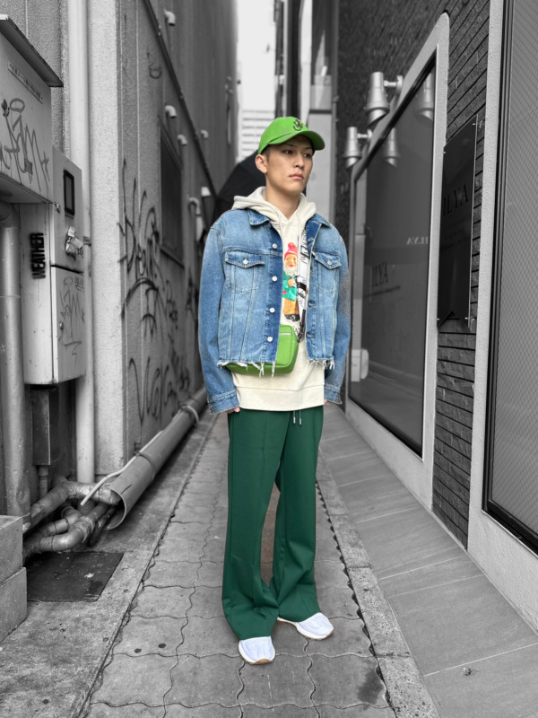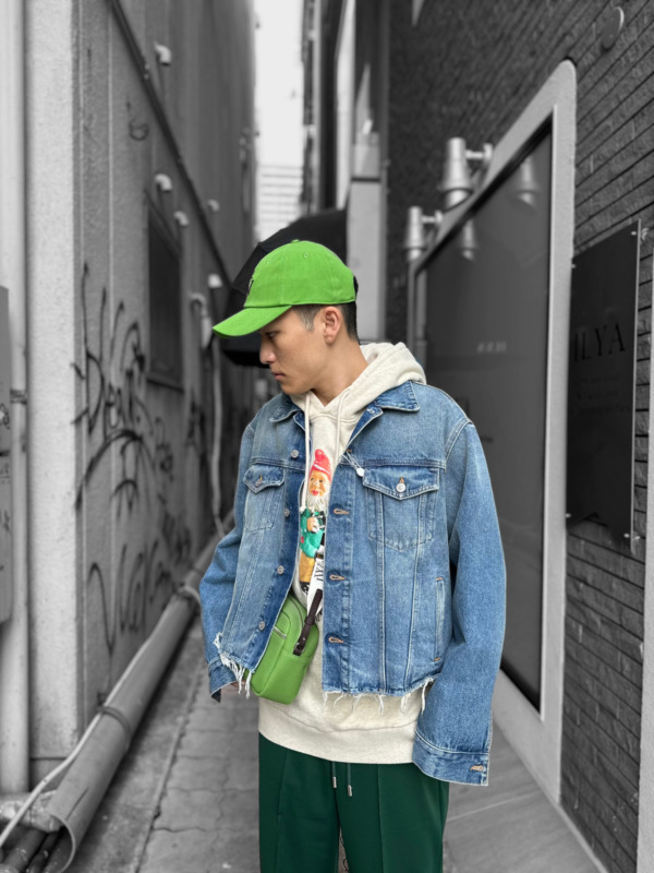 コーディネートのアクセントになるバックとキャップはJWアンダーソン。ファッション界ではトレンドカラーとされる鮮やかなグリーンカラーが映えます。共に、コットン素材で春の軽快な装いを格上げしてくれます。