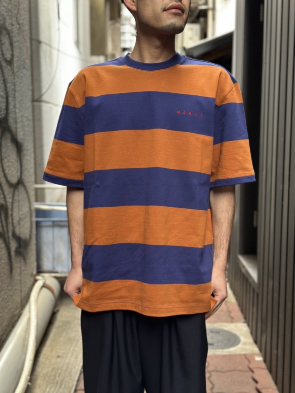 春夏らしいカラーのマルニのボーダーコットンTシャツ。オレンジとブルーのカラーリングで、マルニならではの独特の色使いが見事です。